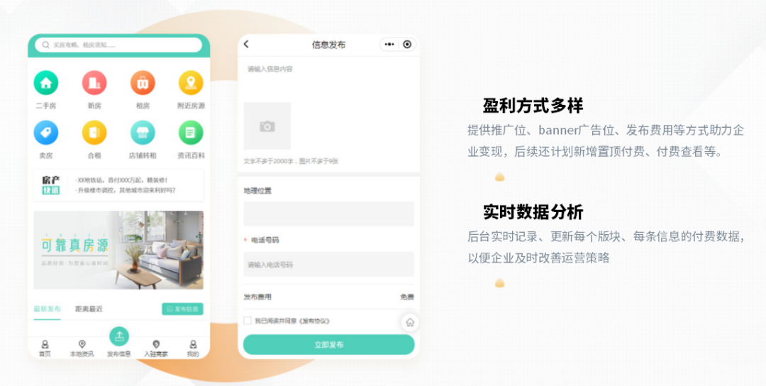 吸引本地房东、中介和经纪人发布楼盘、出租屋和商铺租赁,在这基础上,可以收取频道费、中介费,打造本土化的58同城/同镇。