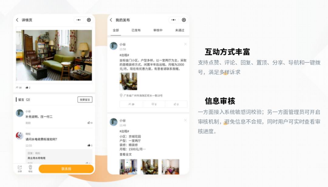 管理员可对信息进行审核、删除,保障信息安全;信息支持多种互动方式,方便作者和用户进行交流互动。