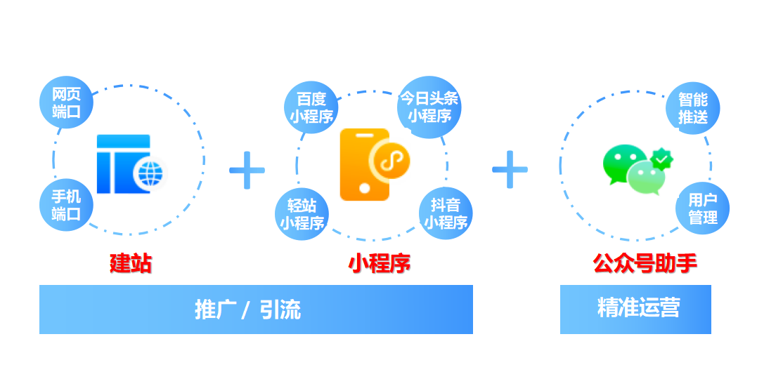如果你正苦于线上推广收效甚微,不妨试试这套“建站(官网)+小程序+公众号助手”的组合拳,相信一定能有所突破哦!注:本月联系我们搭建官网、小程序、公众号助手还能享受超值优惠价!